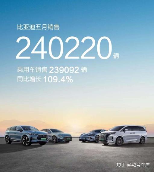 比亚迪发布 5 月份产销快报,共销售新能源汽车 24.02 万辆,同比增长 108.99%,环比增长 14.23%。单月销售24万辆的成绩,也打破了此前比亚迪在 2022 年 12 月份销售 23.52 万辆的记录,创下月度历史新高。