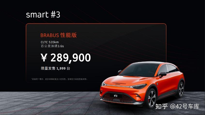 6 月 1 日,smart 精灵 #3 在国内上市并开启预定,并将在 6 月内正式开启交付。 smart 精灵 #3 带来 Pro+、Pulse 四驱版、Premium、BRABUS 性能版四款配置车型,官方零售价为人民币 20.99—28.99 万元(不含付费选装)。其中 BRABUS 性能版车型 2023 年限量发售 1,999 台。