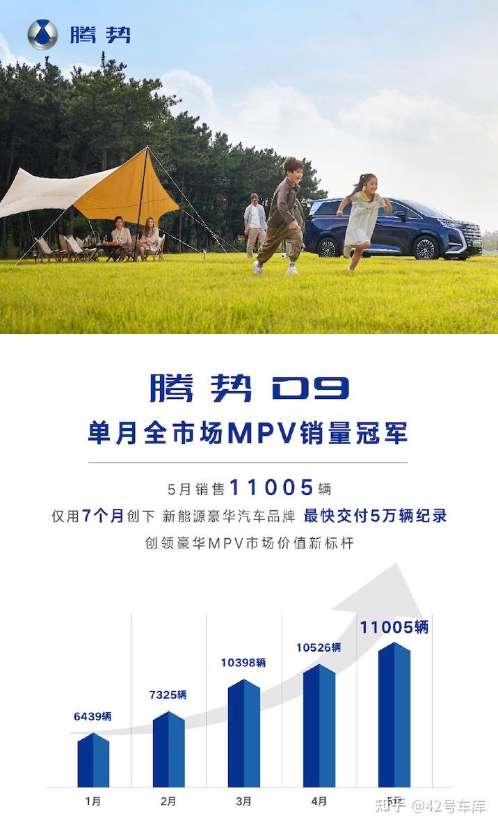 5 月腾势 D9 车型销售 11,005 辆,登顶单月全市场 MPV 销量冠军。截止 5 月份,腾势 D9 已累计交付 55,496 辆,仅用 7 个月创下新能源豪华汽车品牌最快交付 5 万辆纪录。