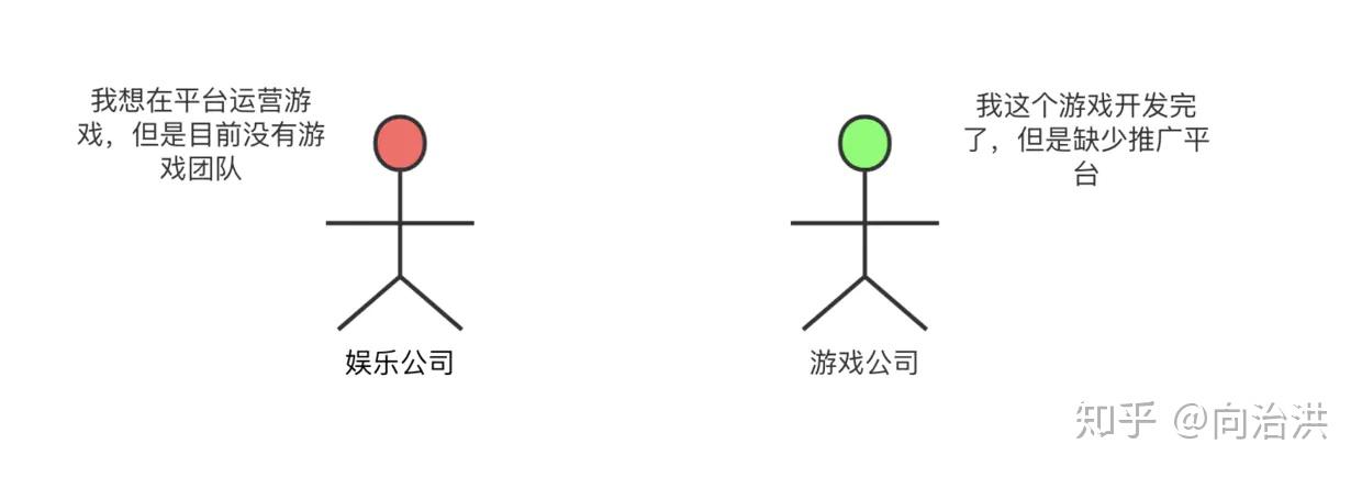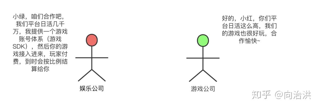 在上面的图例中,小红是做社交App的娱乐公司,日活几千万,想让自己平台多元化,比如做个游戏下载的功能,给用户下载,用户觉得好玩,可能就会付费买装备,但是有个问题,小红并不会做游戏,如果单开一个产品线去研发游戏,投入是相当巨大的,所以想到能不能去外面接游戏进来。