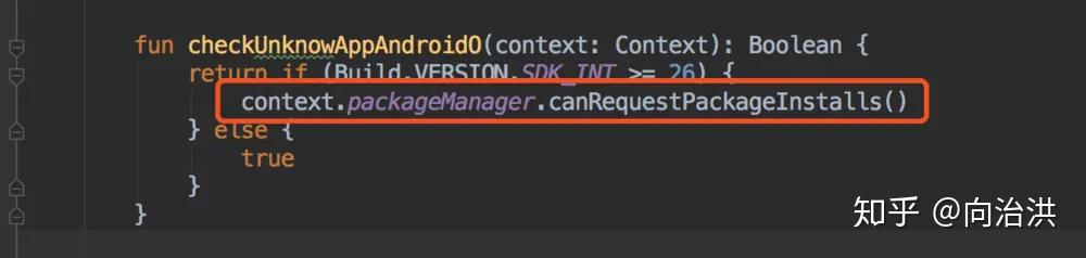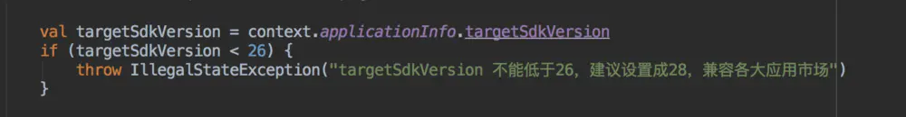 然后,我们去掉权限声明验证发现还是会抛异常,说明不是这个原因。最后,经过分析发现当 targetSdkVersion 小于26的话, packageManager.canRequestPackageInstalls()一直会返回false,所以各大应用市场已经陆续要求targetSdkVersion必须26或以上,为了保证SDK的更新功能正常,在SDK初始化的时候,添加如下检测代码。