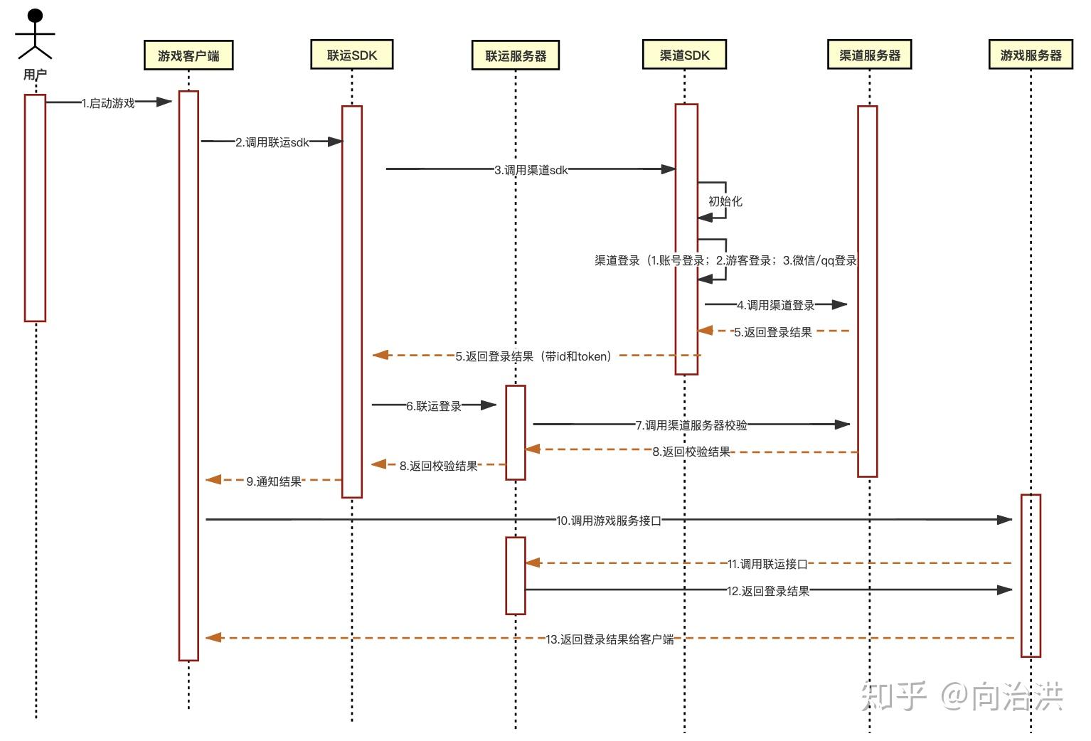 游戏SDK最核心的功能就是登录和支付,其它都是一些运营相关的,例如埋点、数据统计、崩溃等等。其中,登录的流程大体如下。