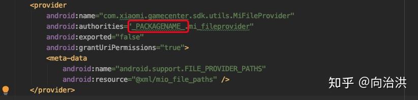 如果是Android Studio打包,一般会自动读取build.gradle中的_PACKAGENAME_的值来替换占位符_PACKAGENAME_的数据,如果是Eclipse打包,占位符_PACKAGENAME_则原封不动,不会被替换。不管使用Eclipse打包就会报一个空指针,如下所示是Eclipse代码。