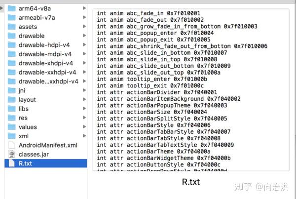 Android的打包流程可以查看: Android打包流程 apk编译的第一个阶段,AAPT会打包资源文件,生成R.class文件和resources.arsc资源索引表。对于library项目,在打包aar的时候,aar中并不需要生成 resources.arsc 资源索引表,资源的id跟资源文件的映射关系记录在R.txt中,如下图所示。