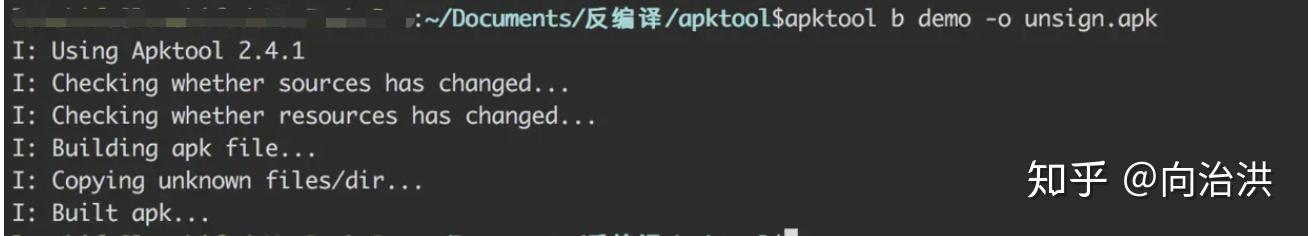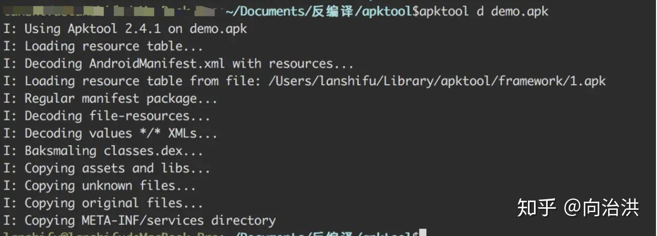 其中,如果不指定目录那么默认会输出到原目录,如果需要指定目录,那么可以使用-o 参数来指定输出目录。反编译之后,接下来就可以修改资源文件或者字节码。