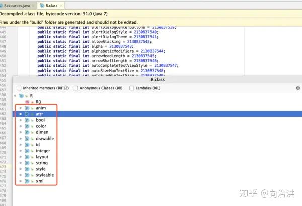 其中,第一个参数是资源名称,如一个TextView定义的id叫tv_title;第二个参数是类型,如 string、xml、style、layout 等等,跟R.class文件里面的内部类是对应的;第三个参数是应用的包名。例如,下面是第二个参数的R文件对应。