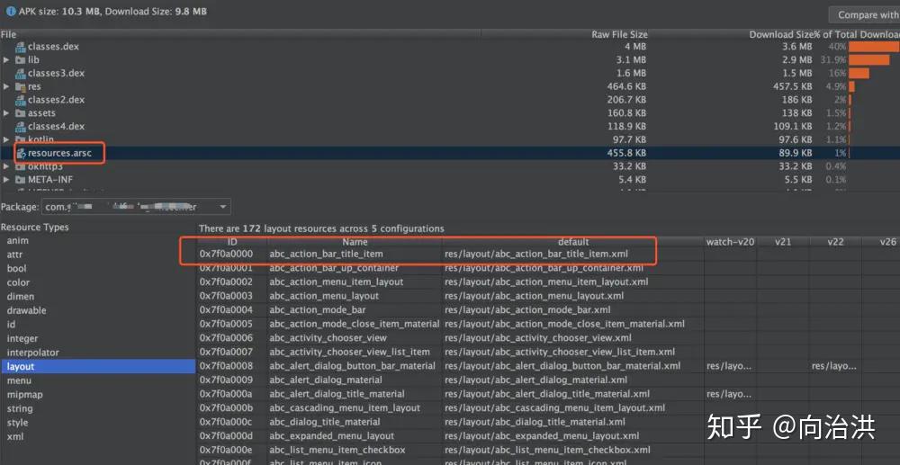 我们需要重点关注的是资源索引表 resources.arsc,resources.arsc 文件的数据格式比较复杂,我们可以将apk文件拖到Android Studio中,然后选择 resources.arsc打开,如下图所示。