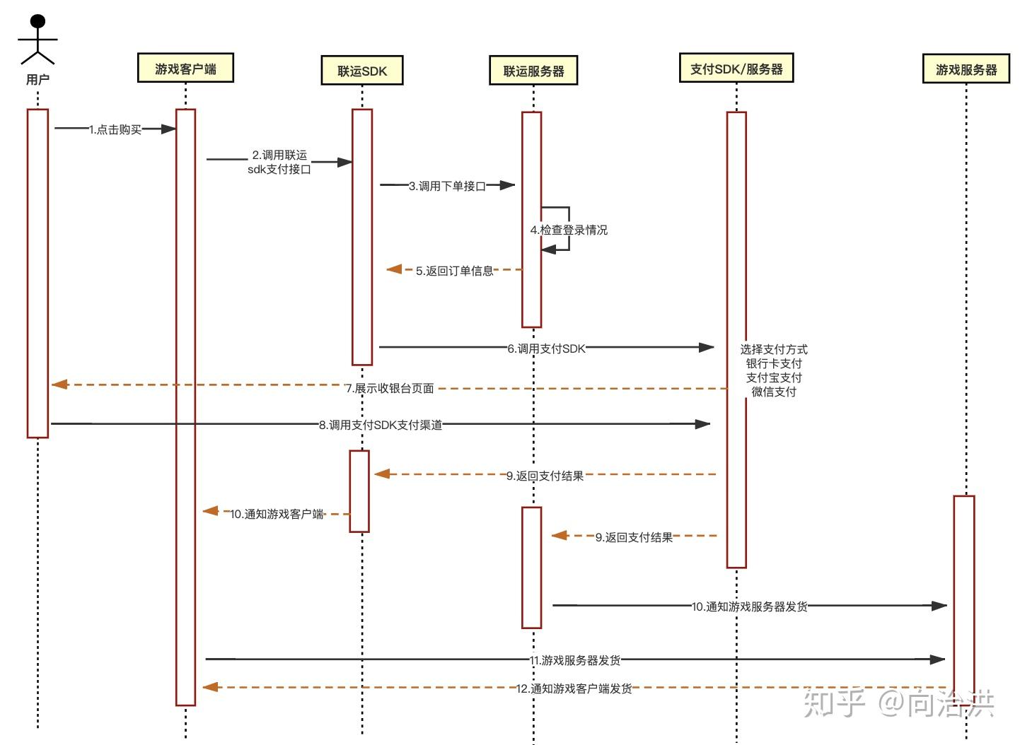 而支付的流程大体是先SDK,然后再通知游戏支付结构,流程如下所示。
