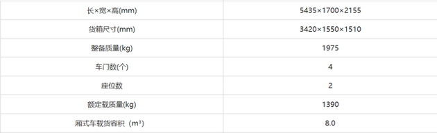 新车的车身尺寸为:5435*1700*2155mm,轴距为3105mm。此外,车内货箱的尺寸为3420*1550*1510mm,货箱容积为80立方米。
