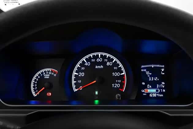 机械指针式仪表,左侧为电机转速表、中间为时速表、右侧为电量/公里数等信息。