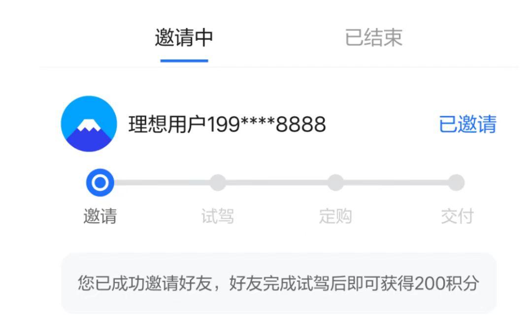 - 邀请好友首次试驾理想汽车,好友到店完成试驾,邀请人即可获得200积分;