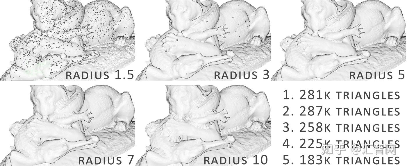 Facet是否与点的Vertex法线一致。如果不是,那么我们拒绝该三角形并创建一个洞。 - 如果表面有折痕或凹谷,使得表面与自身之间的距离小于球的大小怎么办? 在这种情况下,球只会在折痕上滚动并忽略折痕内的点。但是,这不是理想的行为,因为重建的网格对对象不准确。