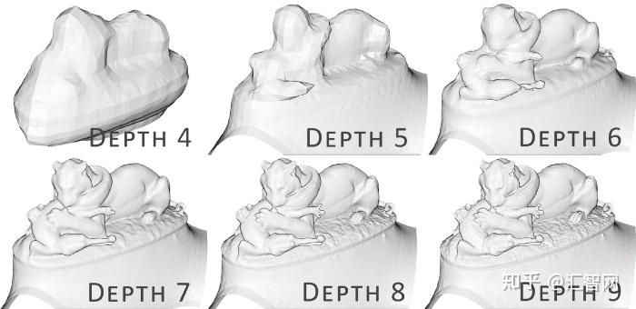 - 哪个深度? 树深度用于重建。网格越高,网格越详细(默认值:8)。对于嘈杂的数据,您可以在生成的网格中保留异常值的顶点,但算法不会检测到它们。因此,较低的值(可能在 5 到 7 之间)会提供平滑效果,但会丢失细节。深度值越高,生成的网格的顶点数量就越高。