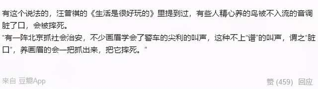 根据网友的科普,脏口儿并非指的是脏话,而是有些人精心养的鸟,学会了别的声音,使得自己的叫声不再纯粹。比如汪曾祺的书中提到过,“有一阵北京抓社会治安,不少画眉学会了警车的尖利的叫声,这种不上“谱”的叫声,谓之“脏口”,养画眉的会一把抓出来,把它摔死。”