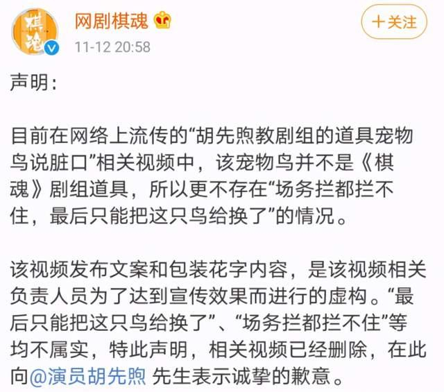 而短视频平台也删除掉了原本的视频,放出了澄清视频,原来说“GIAO”的是其他的工作人员,胡先煦只是跟着学了逗鸟,说了一句后被劝阻就立刻教八哥说“恭喜发财”。