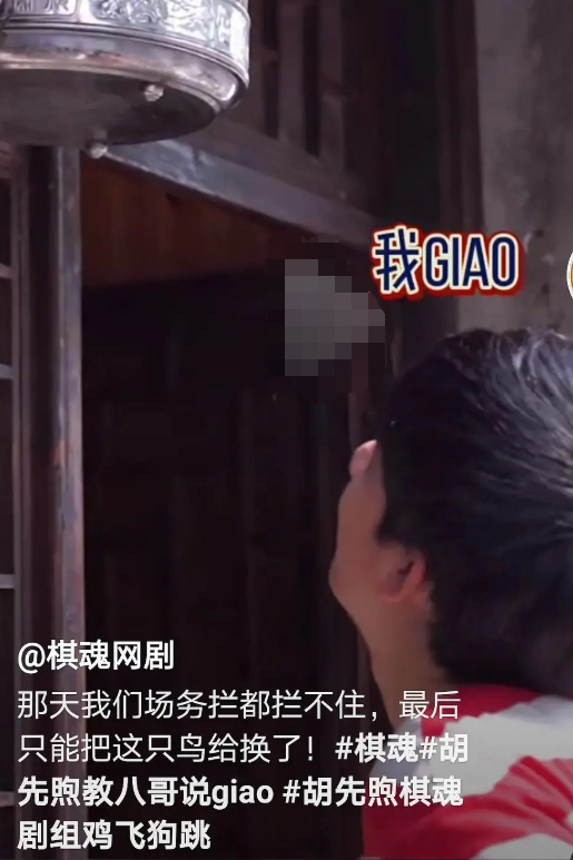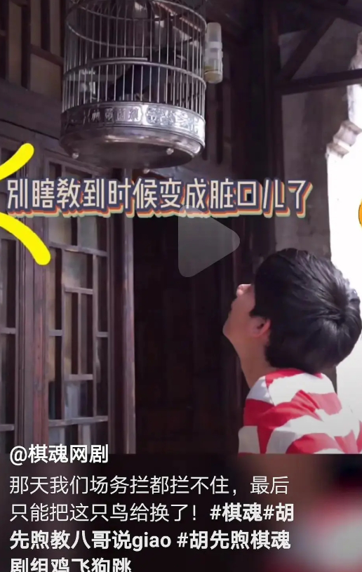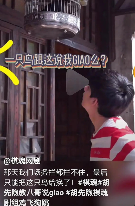 视频中,胡先煦教一只八哥说“GIAO”,旁边有工作人员拦着对方让他不要瞎教,不然到时候八哥变成脏口儿,可胡先煦执意不听。工作人员带话题“胡先煦教八哥说‘GIAO’”,并表示“那天我们场务拦都拦不住,最后只能把这只鸟给换了”。