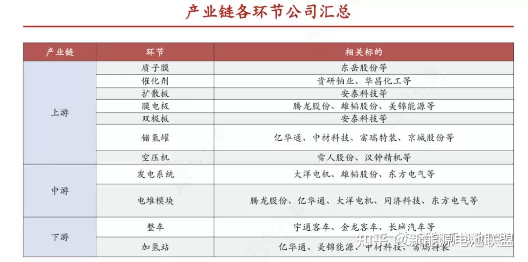 膜电极主要厂商包括腾龙股份、雄韬股份、美锦能源等;双极板和扩散板主要企业有安泰科技等;质子膜主要厂商有东岳股份等;催化剂主要公司有贵研铂业和华昌化工等。