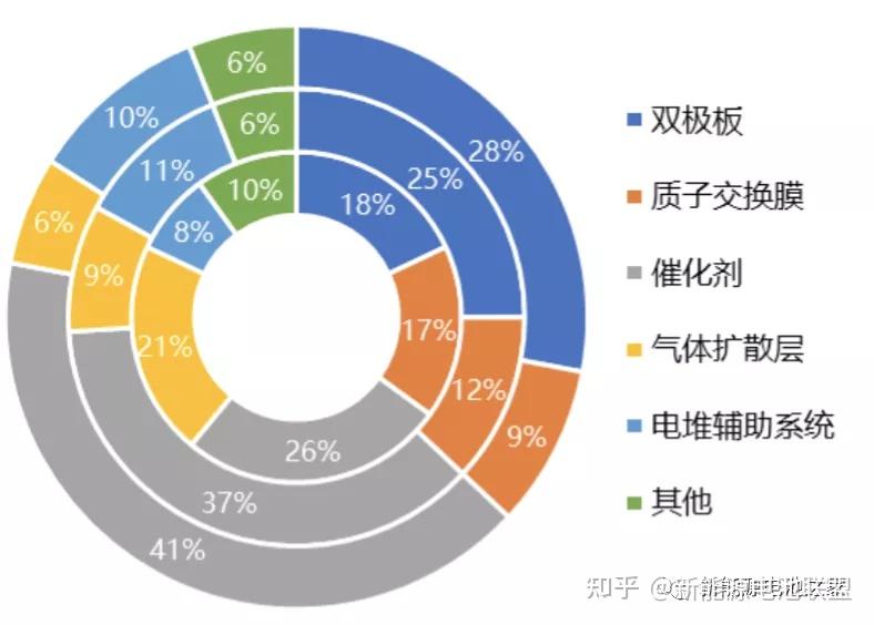 从成本上看,燃料电池电堆约占燃料电池发动机的55%,而膜电极约占燃料电池电堆的65%。
