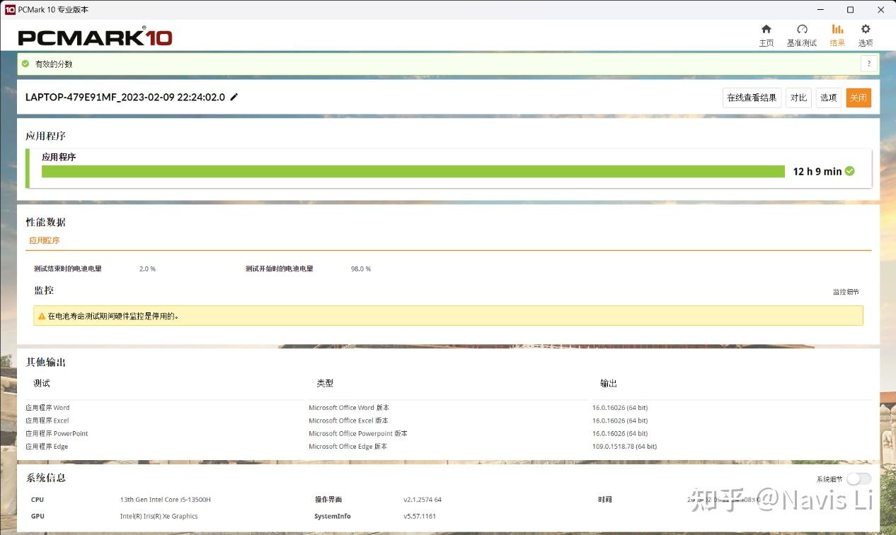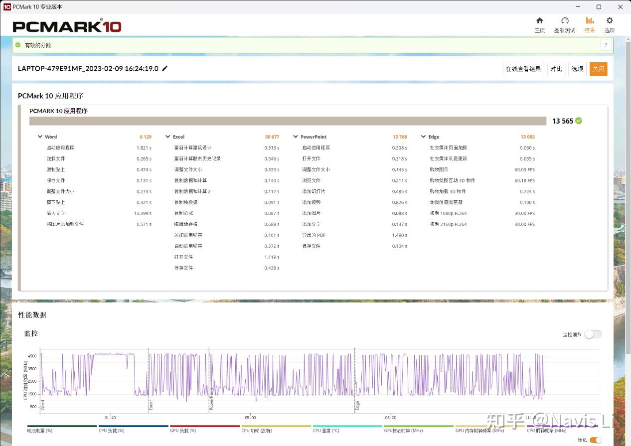 以最接近日常办公体验的 PCMARK10 应用程序测试为例,小新Pro 14可以做到13565的成绩,这个表现并不低,甚至超越了部分12700H,程序加载,Excel 运算等响应速度都很快。