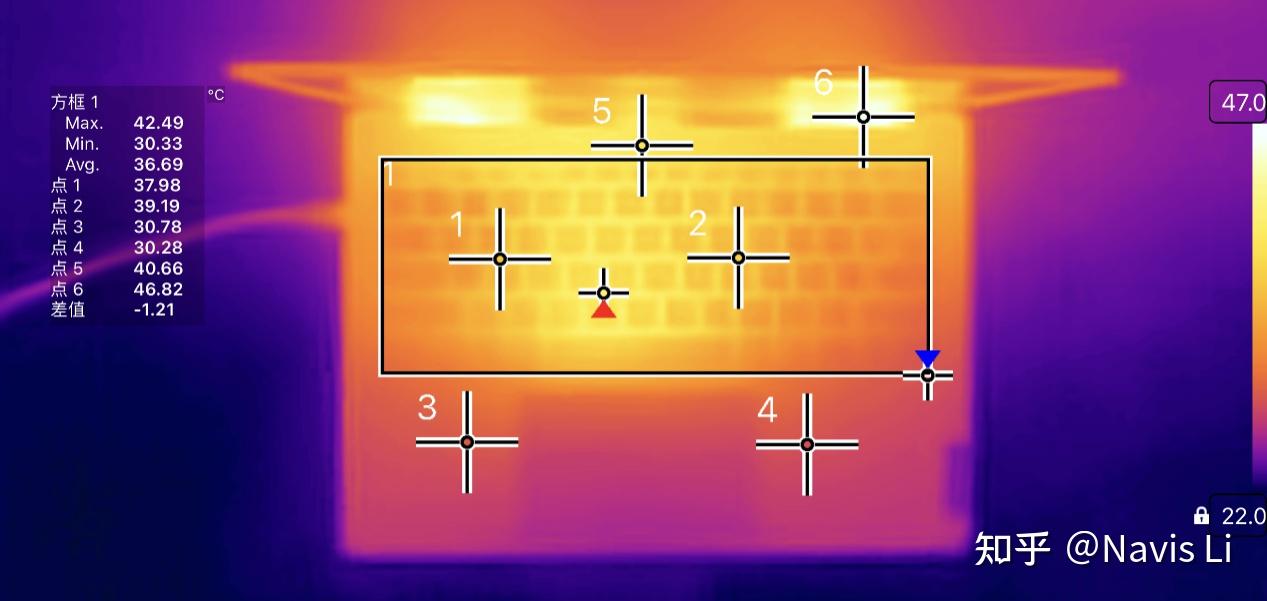 在进一步压力测试中可以看到,随着整机功耗的提高,使得键盘核心区域温度相比上一代也有所提升,最高温达到42.5°C,平均为36.7°C,左右手区域平均在38°C附近。