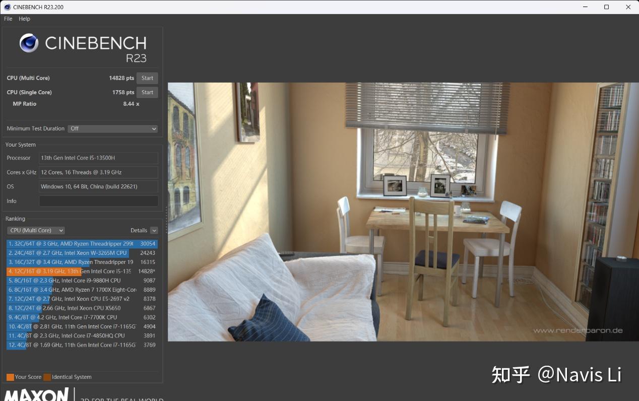 可以看到我手中这台i5-13500H 版CINEBENCH R23 单核做到了1758 pts,多核为14828 pts,功耗提高以后性能确实增加了一些。