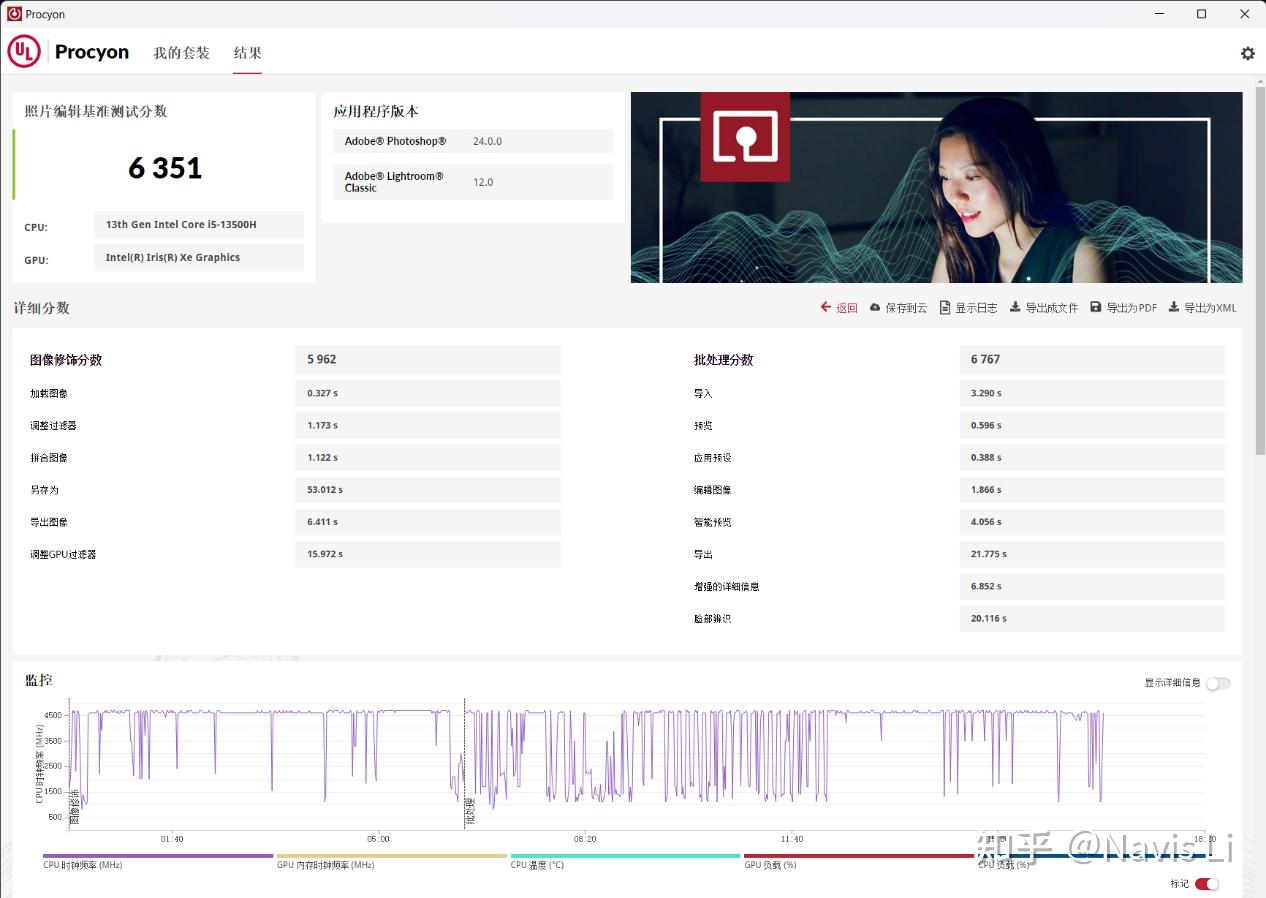 在更高负载的 Procyon 测试中,小新Pro 14的表现也要出色一些,6351的成绩足以满足日常使用需求,而如果你有视频剪辑需求的话,则建议RTX独显版起步。