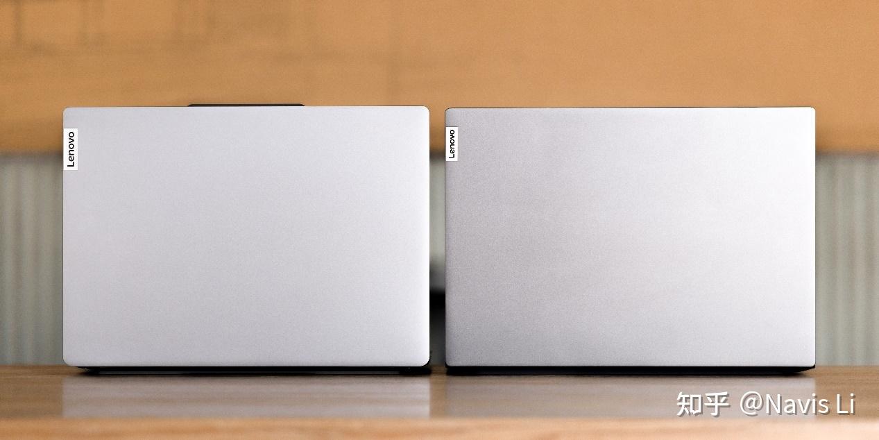 这是两代小新Pro 14,左侧为2023款。如果仅从背面看的话,其实很难看出两者的区别,三维尺寸也差不多大小。实际上可以看到23款的凸刘海更高了,这样单手开合起来会相对顺手,配色相比上一代也要稍浅一些,还有就是logo 更大了。
