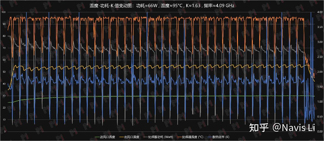 从机身进/出风口的温度以及CPU功耗我们可以判断它的散热效率,我们认为出风口温度越接近核心温度,就意味着散热效率 K 越高。
