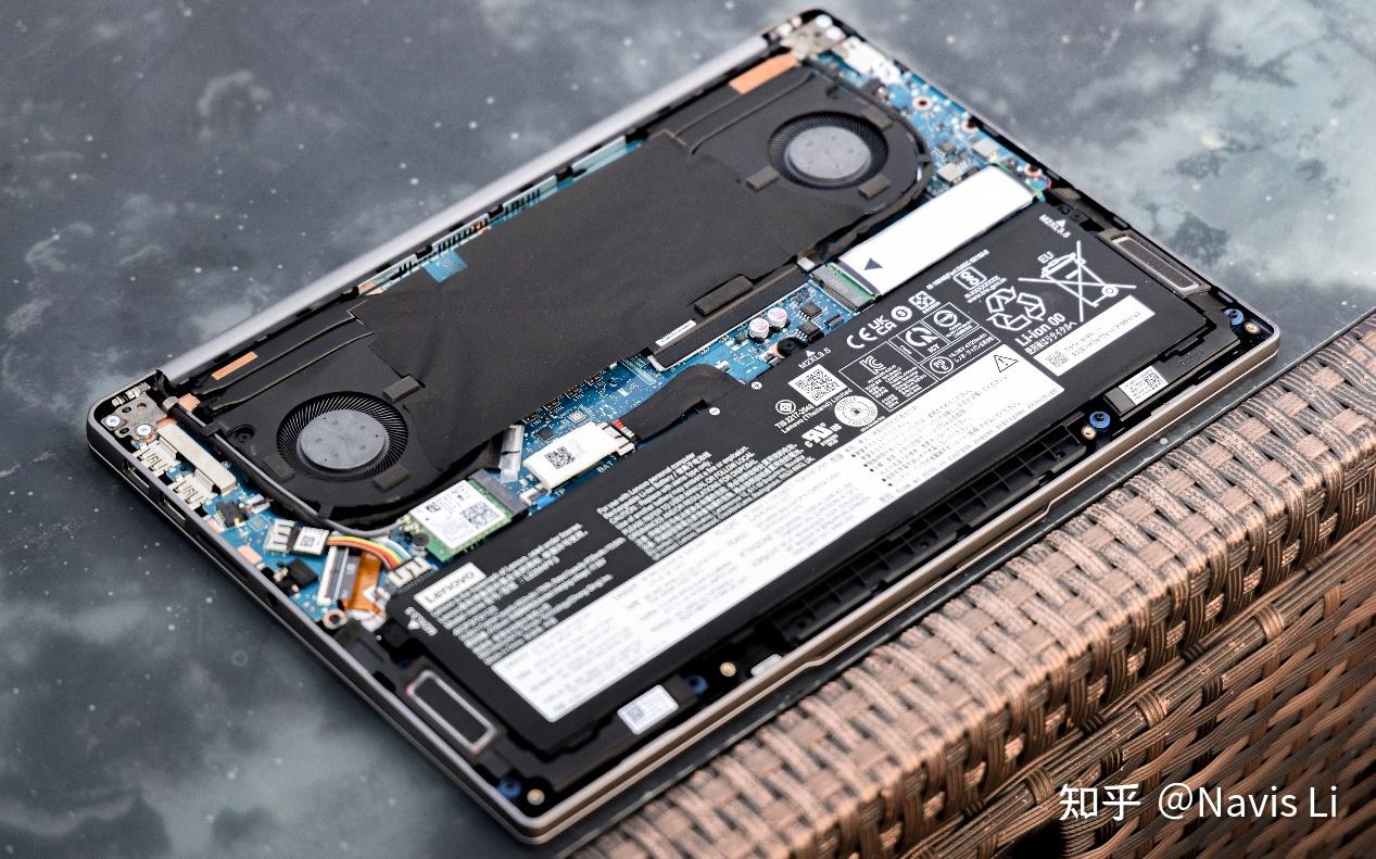 整体结构相较上一代做了调整优化,布局紧凑且规整。上方散热系统占了很大一部分区域,下方电池由之前61Wh 提升到75Wh,理论上续航会增加不少。