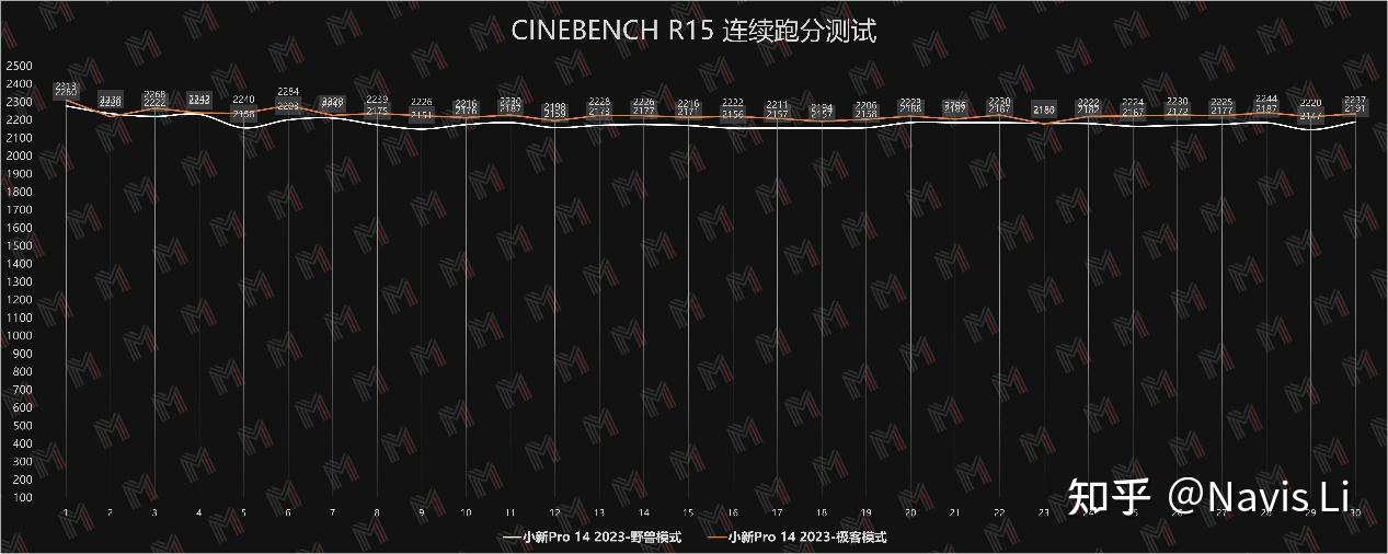 我们知道,以往的小新可以通过FN+Q 在三种散热模式之间切换,而这次新增了极客模式,上一代的野兽模式功耗给到了50W,而这次提升到了60W,极客模式更是给到了65W,从数据中也能看到极客模式下性能更强,并且曲线更加平稳,首次最高可达2313cb,最低2180cb,差值仅为132,平均可以做到2228cb,表现还是很出色的。