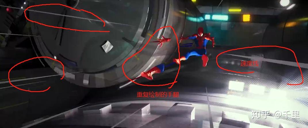 但是每帧都没有运动模糊也会产生问题,就是如果角色两帧之间跨度过大,如果没有运动模糊的视觉连接,就会造成观众的跳帧错觉,意思是,第一帧在a点,第二帧在遥远的b点,因为没有连接而在视觉中有丢失画面的感觉。为了解决这个问题,平行宇宙也用了2d动画质感的运动模糊:-速度线和重复绘制。