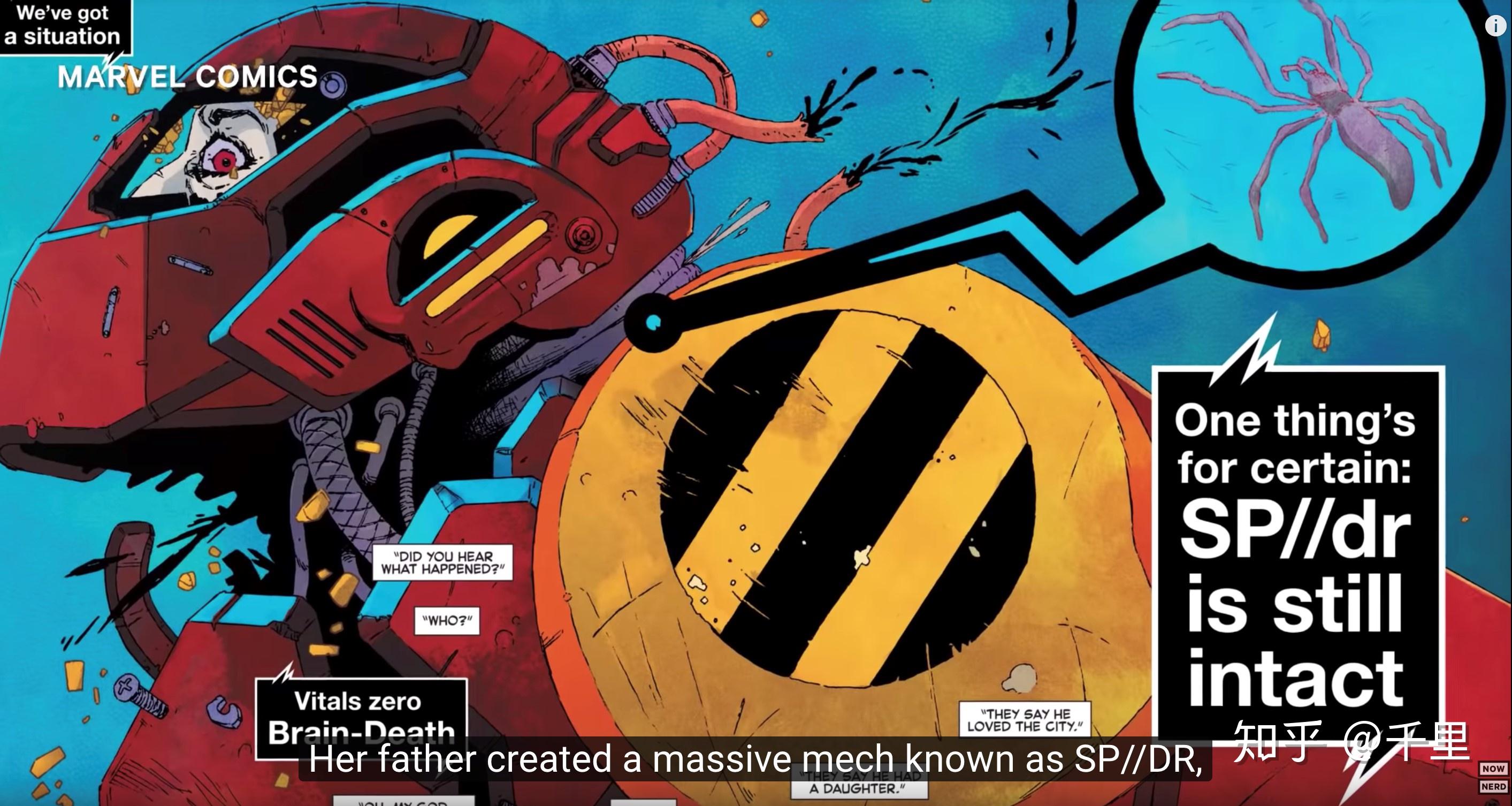 在宇宙14512中的Peni Parker,她的父亲在她9岁时创造了一个名为SP / DR的大型机器人。但是不久他的父亲就去世了,聪明的Peni完成了机器人最后的制作,同时,一个放射性蜘蛛咬了机器人使机器人产生了灵性,于是peni 和 机器人产生了通灵联系。