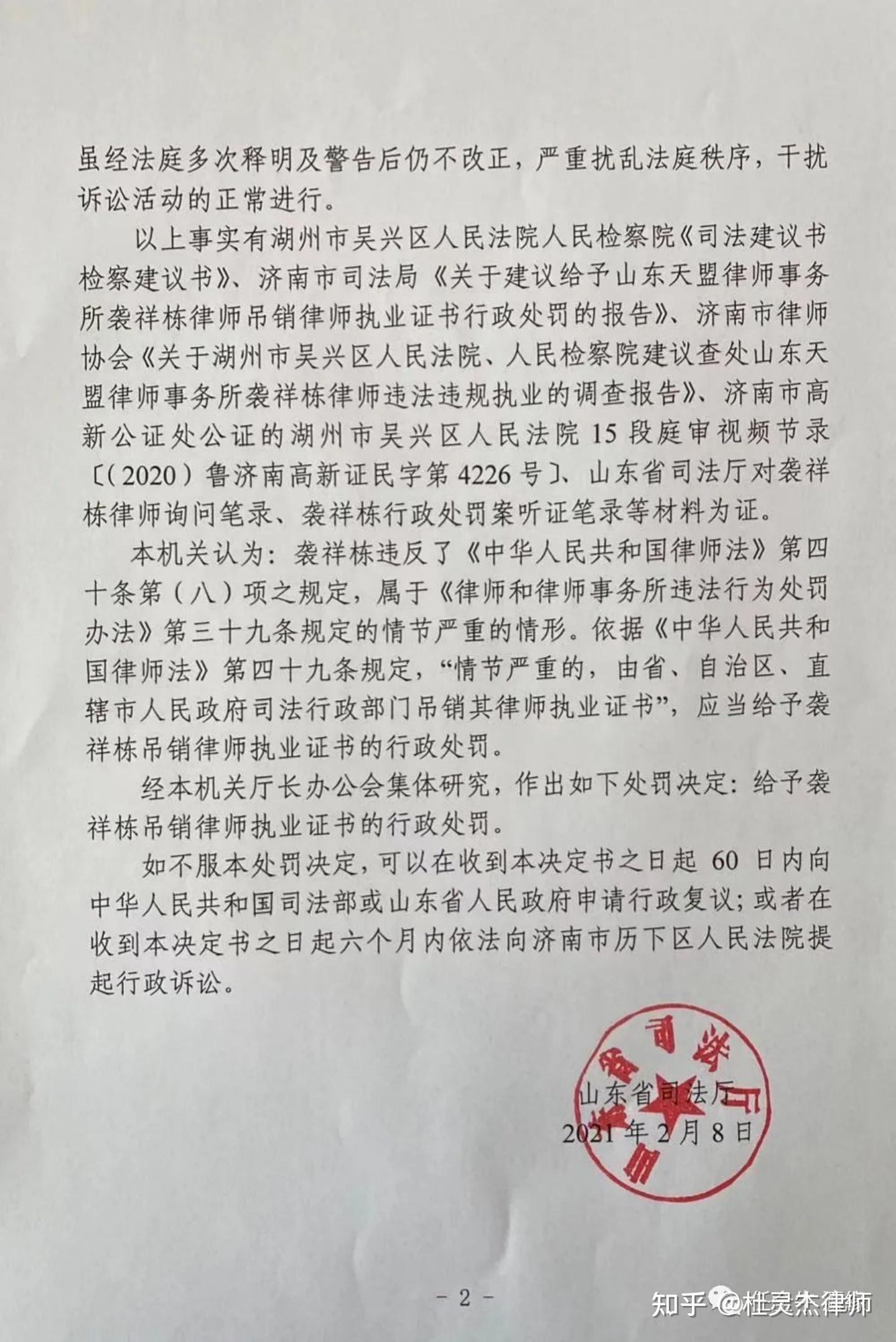 袭祥栋,原山东天盟律师事务所律师,因在庭审中多次不服从审判长指挥,持续打断法官、公诉人发言,未经准许擅自发言,肆意干扰法庭审理,且经法庭多次释明及警告后仍不改正,后被山东省司法厅于2021年2月8日吊销律师证.