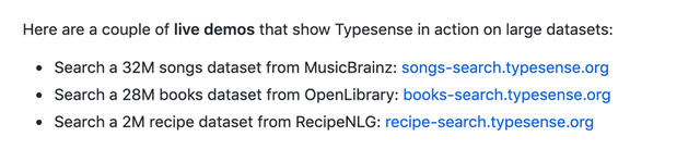 项目团队通过使用公开的数据集搭建了多个搜索引擎,方便大家试用。以下是使用 typesense 搭建的 demo 搜索引擎