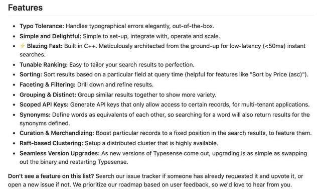 目前 typesense 支持了很多功能,比如错词纠正、可调的排序机制、聚合过滤等,以下是主要的功能介绍: