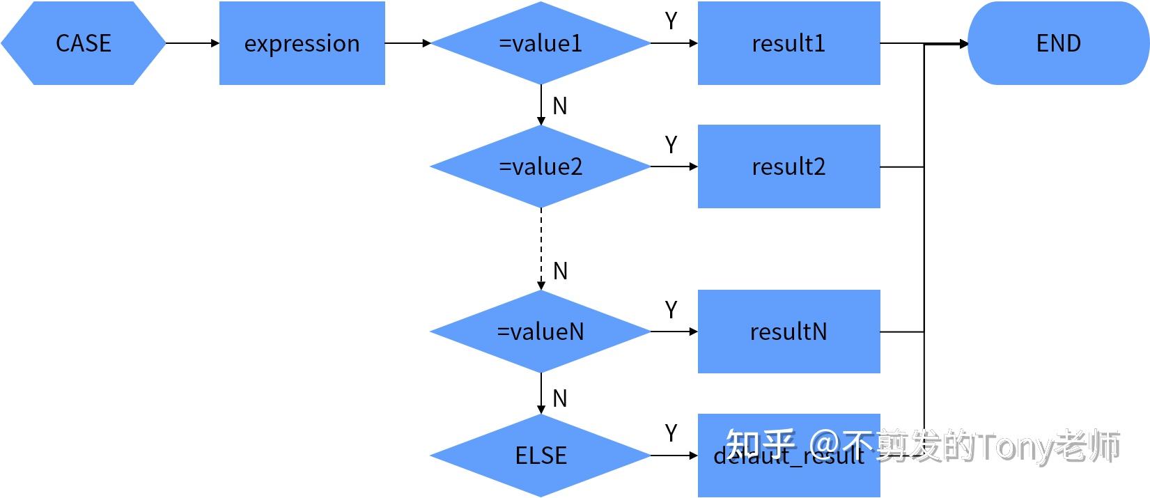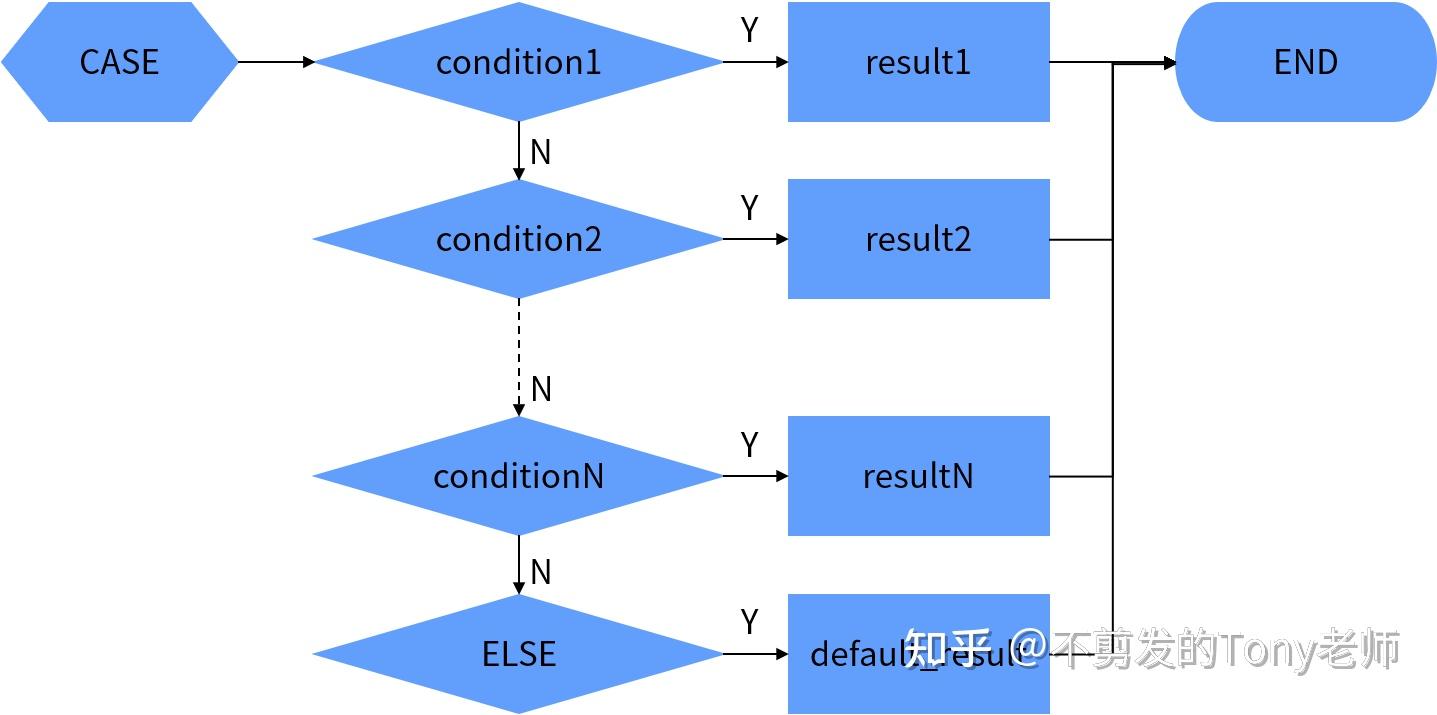 语句执行时首先判断第1个WHEN子句中的条件(condition1)是否成立,如果成立则返回对应THEN子句中的结果(result1);如果不成立则继续判断第2个WHEN子句中的条件(condition2)是否成立,如果成立则返回对应THEN子句中的结果(result2);依此类推,如果没有任何条件成立,返回ELSE子句中的默认结果(default);如果没有指定ELSE子句,返回空值。
