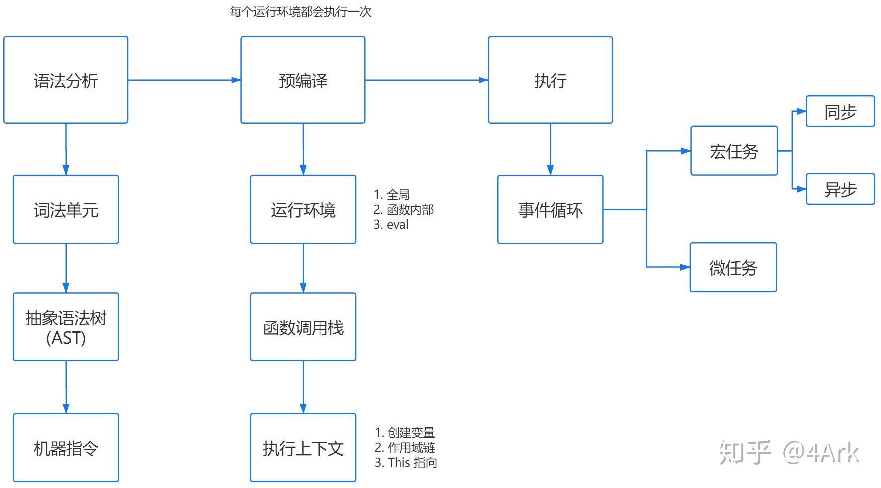 每进入一个不同的运行环境都会创建一个对应的执行上下文,根据不同的上下文环境,形成一个函数调用栈,栈底永远是全局执行上下文,栈顶则永远是当前执行上下文。