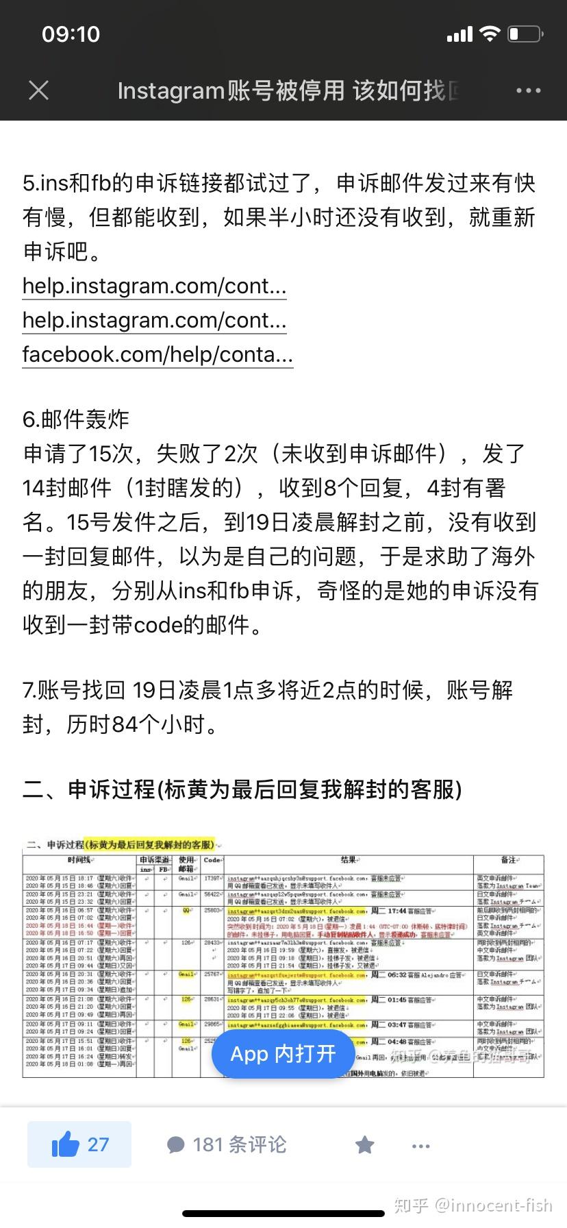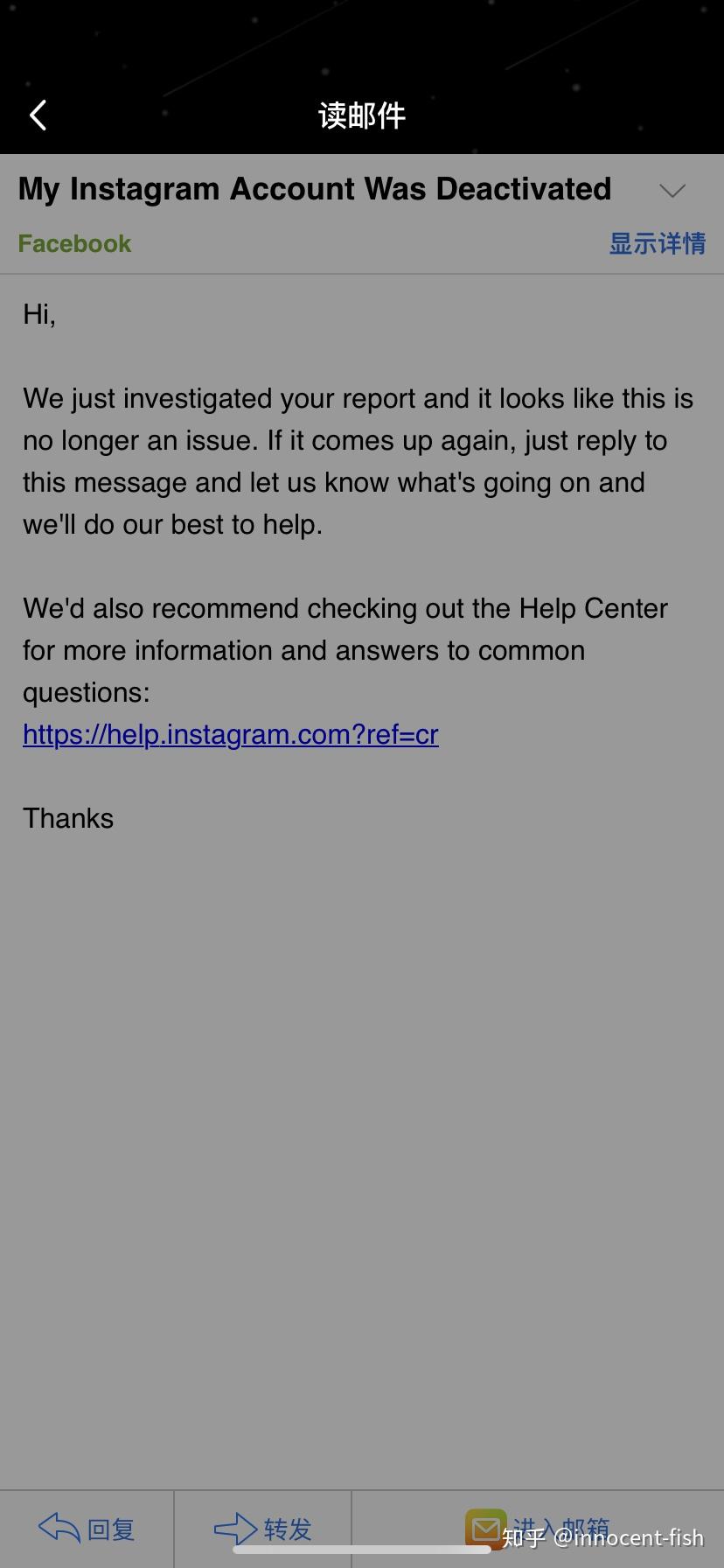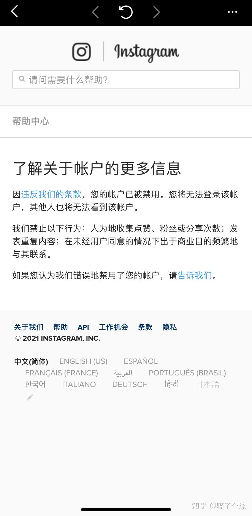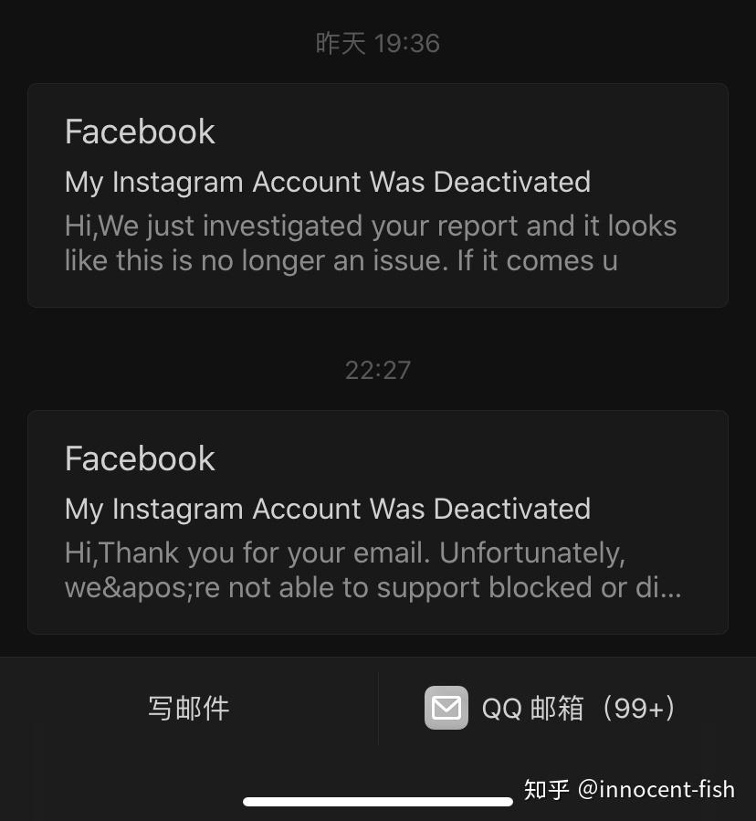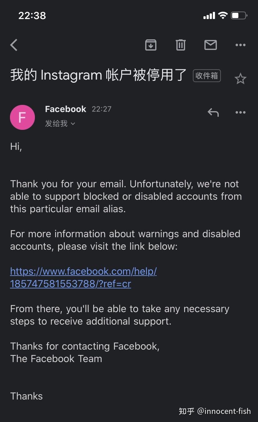 于是按照网友经验和给的官方两个申诉地址申述……Facebook通道我申诉不了,一填完信息页面跳出一个空白一句英文……所以我都是用ins申诉通道。(我连着三天申诉都是工作日内哦)