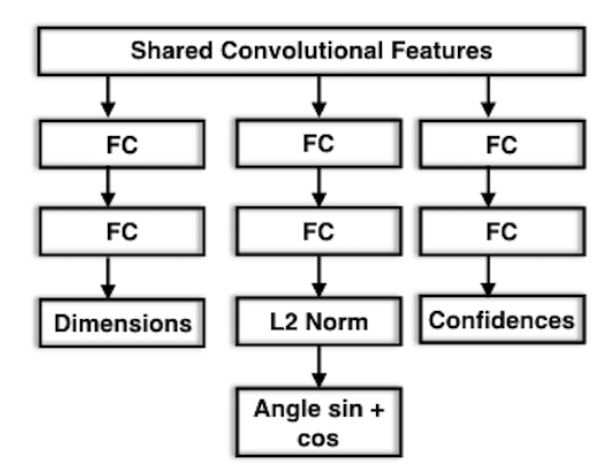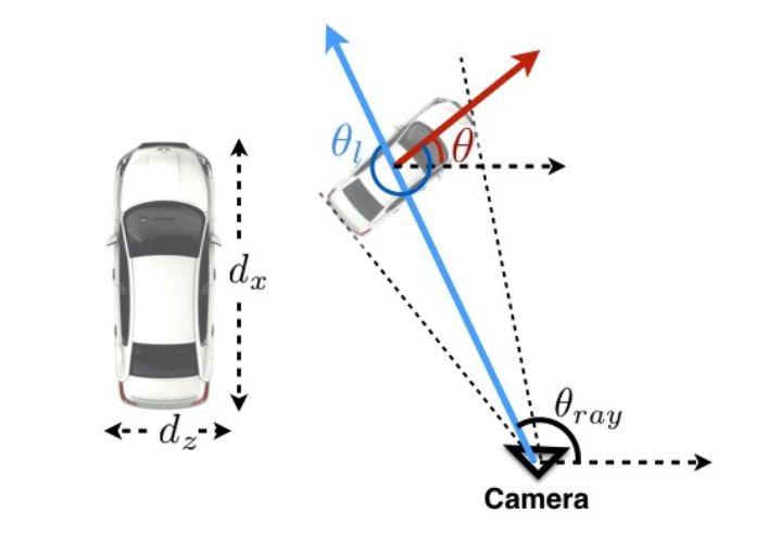 图3. (a):车辆方位角θ的俯视图。方位角是车辆绕y轴的旋转角(车辆高度dy),对于摄像机来说车辆在图像成像看到的是局部的转角θl,若θray为车辆相对于与摄像机的旋转角度,则θ=θl+θray。我们回归的角度是局部转角θl。图(b): 用于角度回归的网络设计。