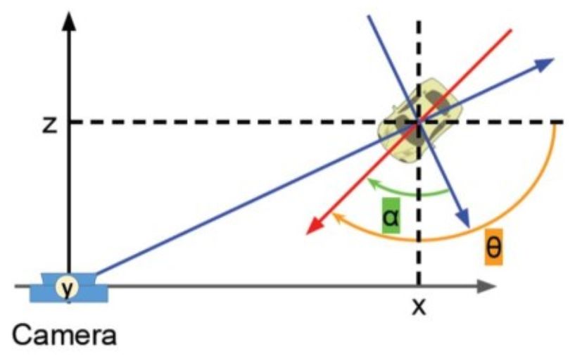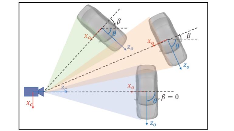 图11:物体的全局方向角是θ,从相机观察的角度是β,物体相对于相机的视角是α=θ+β。由于相同的相机视角α得到近似相同的投影,因此这里回归的角度是物体转角相对于相机的视角α。和其他工作类似,回归采用α的三角函数[sin(α), cos(α)]。