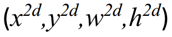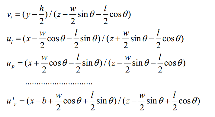 第二步: 计算粗化的3D框。给定相机内 参数 K, 2D边界框,以及方位角α,通过射影几何方法计算3D框。这里,用符号表示检测车辆的3D边框为Bg=(wg,hg ,lg,xg,yg ,zg,θg),其中((wg,hg ,lg)是物体的长、宽、高。(xg,yg ,zg)是物体的中心3D位置。θg是在空间中的朝向角度。这里粗略的估计车辆的长、宽、高采用了车辆识别类型的先验尺寸,即预先统计真实情况下,每种车辆的平均长、宽、高,按照前一步预测的类型直接设定物体尺寸为平均尺寸。根据上图中的观察,可以得到: