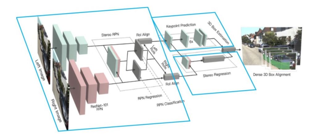 本方法是扩展 Faster-RCNN网络框架到双目立体视觉进行3D 目标检测 的方法[10]。方法的关键步骤是对左右图像的自动对齐学习,以及通过稠密匹配优化最终的检测结果。