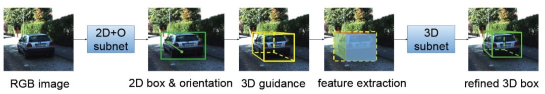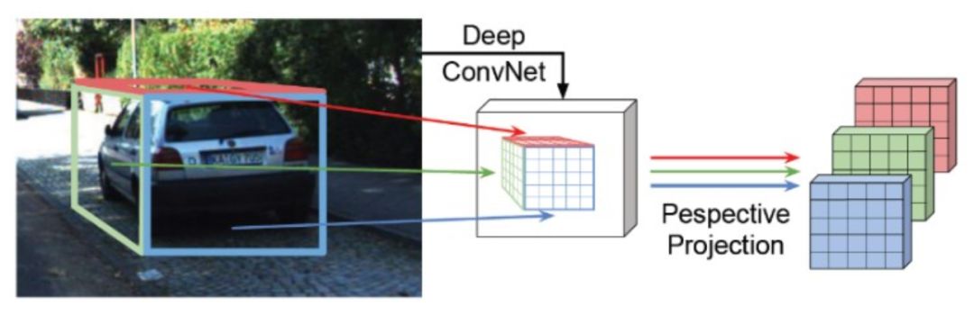 使用图像数据检测物体的3D空间位置,可以通过首先估算3D点云数据,借助点云检测3D目标的流程来检测3D目标。通过图像数据估算3D点云有多种方法,比如Wang [5]借助于CNN方法来仿真3D点云。也可以通过每个点的深度估计来获取图像的近似3D点云[6, 7]。通过图像数据估计3D点云,在使用已有的3D点云方法来检测3D目标,效率较低,容易出现误差累积。近年来,采用射影几何和 机器学习 算法结合的方法,较好的提升基于图像的3D检测算法。