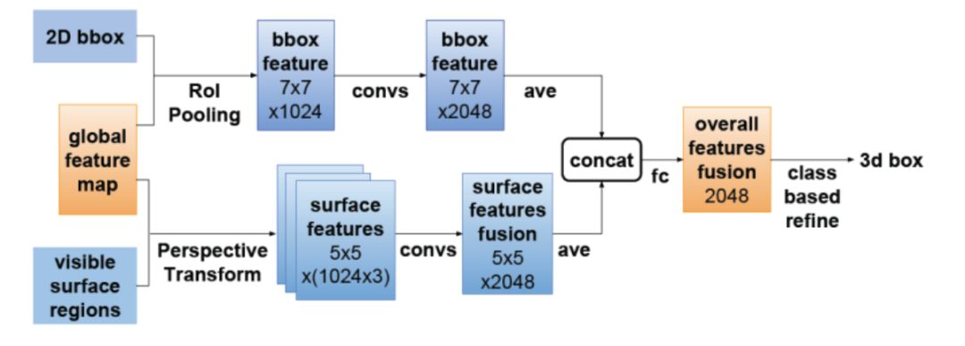 第三步: 重投影表面特征,并精化3D检测框。上述第二步得到的3D框坐标是粗略的(采用平均尺寸作为已知尺寸总是有偏差的),为了计算更准确的3D框坐标,需要根据图像本身特征进行矫正。这里依然使用 深度学习 的方法。
