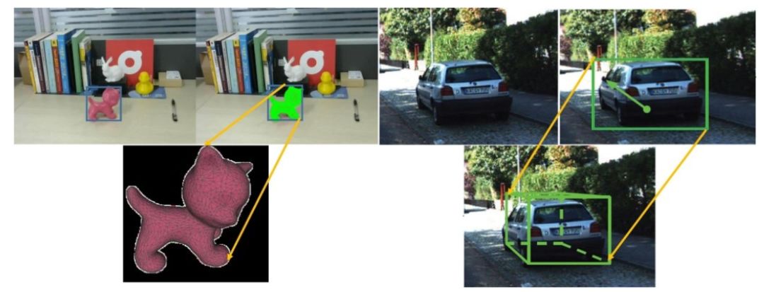左图中,通过检测得到物体三角网格模型。右图中,由图像 特征检测 3D空间立方体来表示物体在空间中的位置。