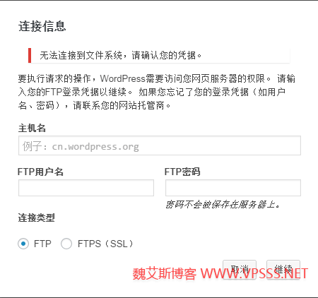 “无法连接到文件系统,请确认您的凭据。要执行请求的操作,WordPress需要访问您网页服务器的权限。 请输入您的FTP登录凭据以继续。 如果您忘记了您的登录凭据(如用户名、密码),请联系您的网站托管商。”上面啰嗦了这么多意思就是你的权限不够,不允许升级。