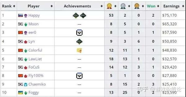 选手的收入是多少呢?中国最顶级的职业选手eer0在今年拿下了8冠5亚的成绩,奖金是57000美元,而统治欧洲各种大小比赛,全年总战绩239胜5负、总胜率98%的Happy今年的奖金是75000美元,其中的50000美元是来自Esl决赛,20000美元来自与ESL相关的DreamHack线上赛和Esl的周赛。