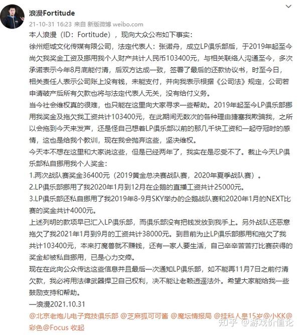 顶级选手如此,一些非顶级的知名选手更惨,10月31日,选手浪漫在微博发布LP俱乐部欠薪相关内容,总计103400元。