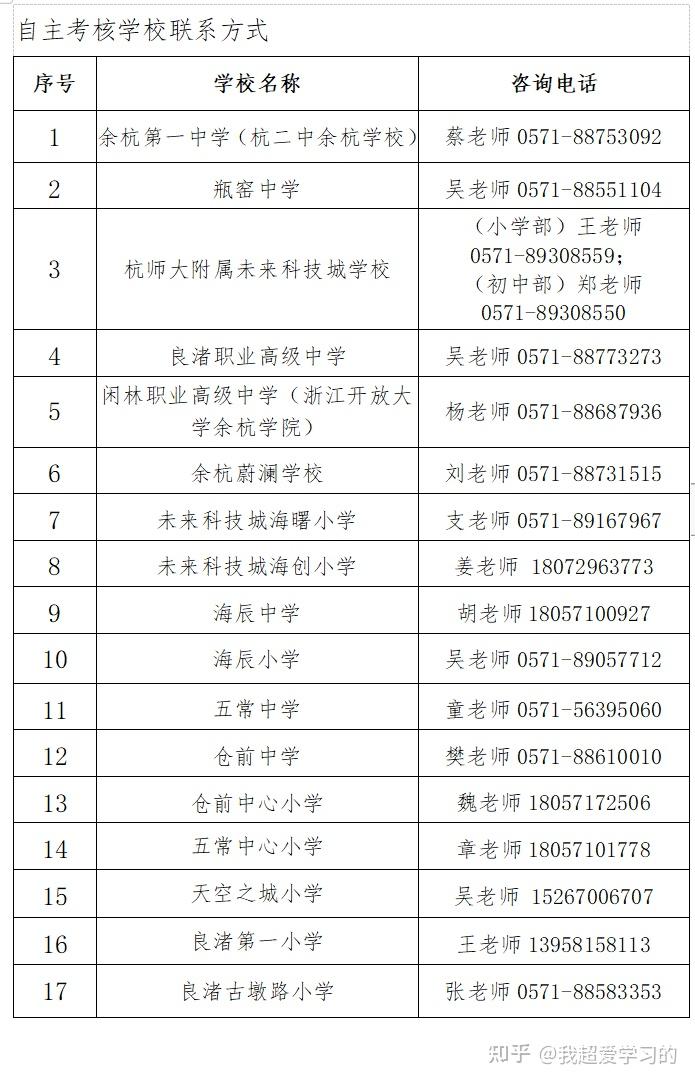 1.学校名单:余杭第一中学(杭二中余杭学校)、瓶窑中学、良渚职业高级中学、闲林职业高级中学(浙江开放大学余杭学院)、杭师大附属未来科技城学校、五常中学、五常中心小学、仓前中学、仓前中心小学、天空之城小学、余杭蔚澜学校、未来科技城海创小学、未来科技城海曙小学、海辰中学、海辰小学、良渚第一小学、良渚古墩路小学、凤凰小学、闲林中心小学、中泰中心小学、径山镇潘板中心小学。