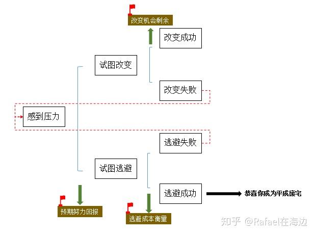 ① 基本的逻辑是,开端是青年“感到压力”,ta可以选择试图改变或者试图逃避,改变的结果是改变现状成功或者改变现状失败,逃避压力的结果是逃避成功或者逃避失败